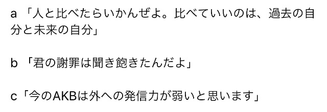 NMB48検定〜Vol.8〜 エンタメ - アイドル NMB48 Q1次のうち大阪府出身ではないのは? 選択肢吉田朱里山本彩加村瀬紗英梅山恋和 Q2次のうち奈良県出身ではないのは? 選択肢石田優美渡辺美優紀太田夢莉鵜野みずき Q3次のうち滋賀県出身ではないのは? 選択肢近藤里奈上西恵南波陽向内木志 Q4次のうち京都府出身ではないのは? 選択肢東由樹井尻晏菜山尾梨奈西村愛華 Q5次のうち兵庫県出身ではないのは? 選択肢新澤菜央森田彩花三宅ゆりあ山崎亜美瑠 Q6今や数々のドラマや映画に出演している俳優の横浜流星さんが過去にNMB48のMVに出演した楽曲は?選択肢フェリー君にヤラレタ妄想マシーン3号機スターになんてなりたくない Q7ファンの間で知られる名言a〜cは、どのメンバーのものか。その組み合わせとして正しいものは?選択肢a-吉田朱里 b-山本彩 c-木下百花a-山本彩 b-木下百花 c-吉田朱里a-木下百花 b-山本彩 c-吉田朱里a-山本彩 b-吉田朱里 c-木下百花 Q8次の出来事と日付が異なる組み合わせを1つ選べ。(2018年編) 選択肢18thシングル「欲望者」リリース➖4月3日「矢倉楓子卒業コンサート~同じ空の下で~」開催➖4月4日山本彩プロデュース研究生「夢は逃げない」公演初日➖9月26日「SAYAKA SONIC ~さやか、ささやか、さよなら、さやか~」開催➖10月27日 Q9下記のa〜dのうち、大阪城ホールで行われていないのは? 選択肢NMB48 3rd Anniversary LiveNMB48 Arena Tour 2015 ~遠くにいても~NMB48リクエストアワーセットリストベスト235 2016NMB48 9th Anniversary Live Q10下記のa〜dのうち、神戸ワールド記念ホールで行われていないのは? 選択肢渡辺美優紀卒業コンサート〜最後までわるきーでゴメンなさい〜NMB48コンサート2016 Summer~いつまで山本彩に頼るのか?~NMB48 7th Anniversary Live太田夢莉卒業コンサート~I wanna keep loving you ! ~