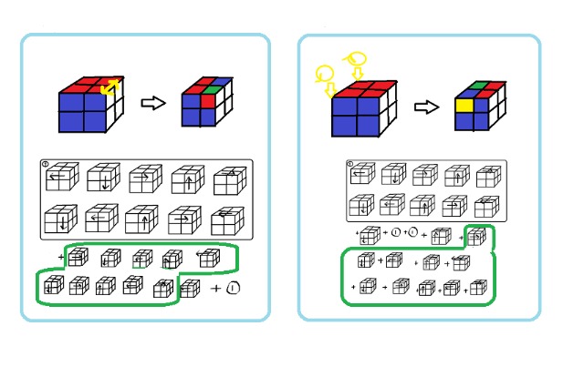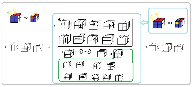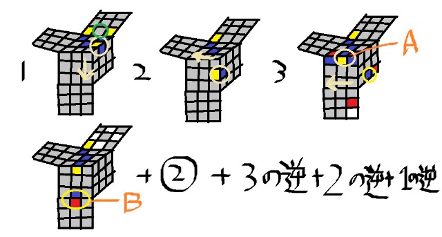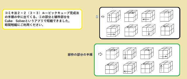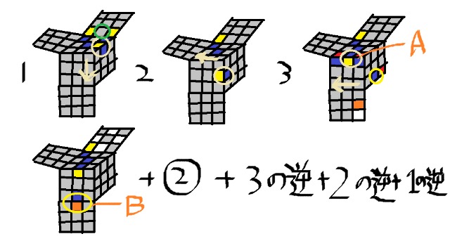 コミキ法オリジナル版(3×3ルービックキューブ6面完成法)手順をチェック検定 3×3ルービックキューブ6面の揃え方(手順)をチェックできます。角キューブを2つの手順で、エッジキューブを一つの手順に微調整を加えて揃えます。ルービックキューブの内部構造を幼児の時に(1967年頃にデザインした記憶がある私はやっと2022年になって角キューブを自力で揃えられるようになった記念に小学校の時に読んだエッジキューブの揃え方(岩倉啓祐さんの本を参考(徳光和夫アナ推薦本)を加えて手順をまとめてみました。 参考→・コミキ法(3×3ルービックキューブ6面完成法)手順 https://kentei.cc/k/1585235 ・その他の6面完成法 ・オリジナル版(2×2) https://kentei.cc/k/1585181 ・リピート版2×2 https://kentei.cc/k/1637149 ・プラス版2×2 https://kentei.cc/k/1636892 ・4×4タイプ1 https://kentei.cc/k/1637640 ・4×4タイプ2 https://kentei.cc/k/1637641 ・ルービクキューブ手順(4×4ルービックキューブ6面完成手順集)(3×3ルービックキューブ6面完成に必要な手順は除く) https://kentei.cc/k/1637767 ・タイプ1,4×4 https://app.kentei.cc/k/1638763 ・タイプ115×5 https://app.kentei.cc/k/1638764 ・セカンド6×6 https://kentei.cc/k/1639316 ・6×6 https://kentei.cc/k/1639171 ・7×7 https://kentei.cc/k/1640488 ・8×8 https://kentei.cc/k/1641713 ・9×9 https://kentei.cc/k/1642310 ・10×10 https://kentei.cc/k/1839815 ・ 11×11 https://kentei.cc/k/1840465 ルービックキューブ Q1ステップ1 4つの角キューブを自力で揃える。選択肢〇× Q2ステップ2 残りの角キューブを”図に示す二つの手順を使って揃える。(まず、図の左の手順(二つのキューブが入れ替わる手順)を使って四つの角キューブの位置を揃える。次に図の右に示す二つのキューブが回転する手順を使って四つの角キューブの色を揃える。選択肢〇× Q3ステップ3 3つのエッジキューブの移動させる手順(以下手順②)を覚える(図に示します。)選択肢〇× Q4ステップ4 エッジキューブ(角キューブの間のキューブ)を一つ一つ揃えていく。→ステップ5へ 選択肢〇× Q5ステップ5 エッジキューブ(角キューブの間のキューブ)の揃え方 あ:前操作(緑の〇の位置に入るキューブをその隣の角キューブの色を確認し、決定。 い:そこに入るキューブをAの位置に配置する(図の例では1,2を行った)。 う:まだ、揃っていないエッジキューブをBの位置に配置する(図の例では3の操作を行った)。 え:手順②(3×3ルービックキューブ手順(3つのエッジキューブの移動)をチェック検定)を行う。 お:後操作(前操作の逆の操作を行う)(図の例では3の逆、2の逆、1の逆回転の操作を行った)。 か:図の緑の〇の位置のエッジキューブが揃った。選択肢〇× Q6ステップ6 最後3つのエッジキューブの揃え方。 あ:ステップ5ではBの位置にまだ揃っていないキューブを配置したが、最後の3つになったら、Bの位置にも、Aに配置した後にその隣の角キューブを確認し、180度回転させた状態のエッジキューブを配置する。 い:6面完成選択肢〇× Q7ステップ7 最後の3つになる前に2つのキューブが残った場合。 手順②(3×3ルービックキューブ手順(3つのエッジキューブの移動)をチェック検定)をその2つのキューブに行い、3つが揃っていない状態にする。 選択肢〇× Q8 6面完成選択肢〇× Q9追加の手順→ステップ2で2つのコーナーキューブを回転させる手順をしめしましたが、この手順の逆回転版もここに示しておきます。先の手順の前後に3回転付け加えます。この手順も覚えるとより早く揃えることができます。選択肢〇× Q10参考→コーナーキューブを揃える手順の①の部分と緑枠部分をCube Solverというアプリで短縮できましたので示しておきます。 また、手順まるごと短縮したもの→プラス版と、 そして、単純な手順の繰り返しもの→リピート版もありますのでネットで検索してみてください。選択肢〇×